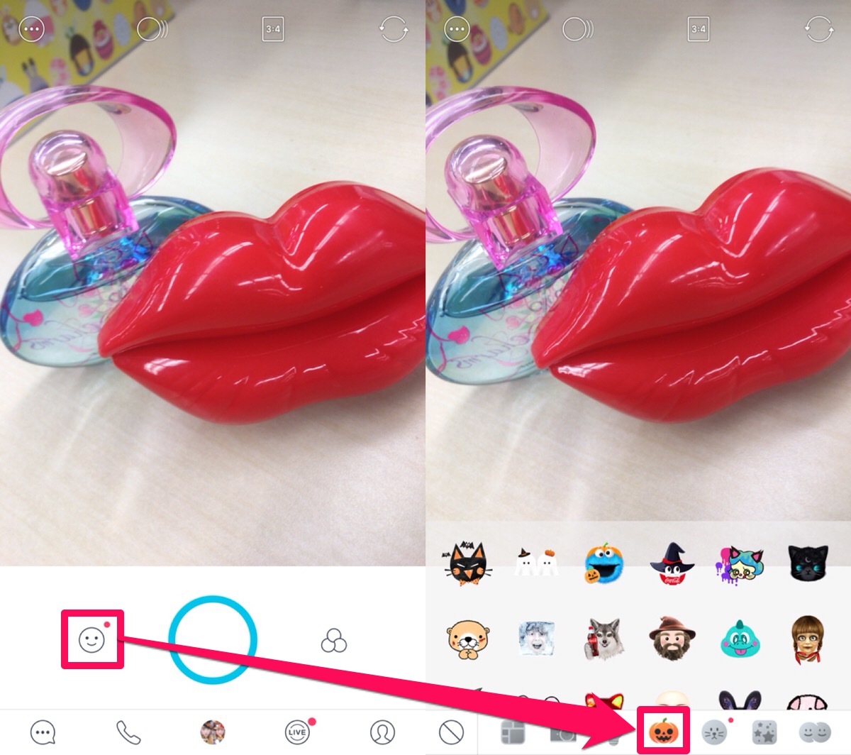 SNOWのハロウィンスタンプは、撮影画面左下にあるアイコンをタップし、さらにパンプキンのアイコンを選択すると出てきます♪